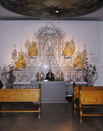 Auf dem Tisch Altargerät aus Meersburg, darüber Lindenholzfiguren von Heiligen.