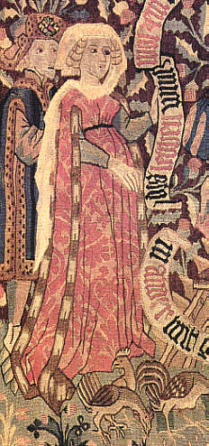 offenbar pelzbesetzten Ärmelenden, dazu auf der aufgesteckten Zopf-Frisur