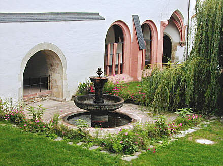 Zisterzienserkloster EberbachBrunnenhaus Nur im Fundament erhalten ist das romanische Brunnenhaus der Zeit vor 1186. Dahinter das einzige erhaltene Stück des romanischen Kreuzgangs. Rechts neben ihm die gotischen Fenster aus dem mittleren 13. Jahrhundert. |