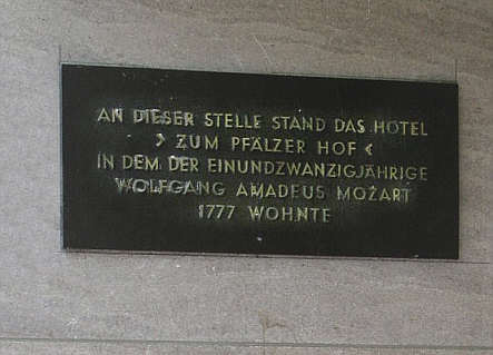 Tafel an der Stelle des ehemaligen Hotels "Zum Pfälzer Hof" mit Hinweis auf W.A. Mozart, der hier 1777 wohnte.