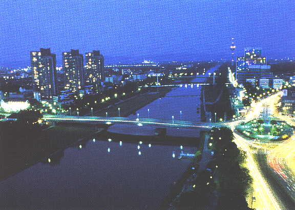 MannheimKurpfalzbrücke und Neckaruferbebauung Im Vordergrund die Kurpfalzbrücke, rechts davon der Kurpfalzkreisel, dahinter Gewerkschaftshaus und Collini-Center, ganz hinten der Fernmeldeturm am Luisenpark. Links die Hochhäuser der nördlichen Neckaruferbebauung. |