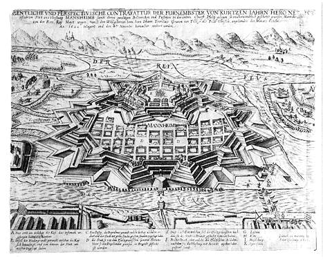 Wichtiger für die Bildtradition des 17. Jahrhunderts aber werden schematischere Darstellung der Festungsanlagen. Die Festung Mannheim galt noch bis ins ausgehende 18. Jahrhundert als beispielhaft. |