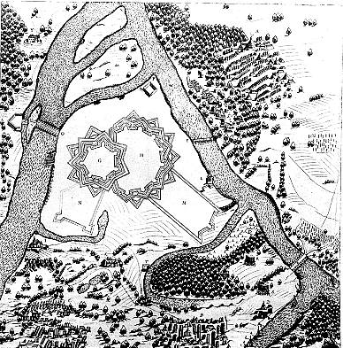 MannheimFestungsanlagenDarstellung aus dem Haus des Frankfurter Verlegers und Stechers Eberhard Kieser, um 1623 Thema der Darstellung sind die Ereignisse des böhmisch-pfälzischen Krieges mit der Eroberung der Festung Mannheim, weswegen Fragen der Topographie der Stadt selbst eher in den Hintergrund rücken. |