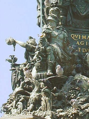 Figur der Constantia (Beständigkeit), die ein Schwert über eine Flammenschale hält und mit der Linken Ketten umklammert. Ihren Kopf bedeckt ein loorbeerbekränzter Adlerhelm.