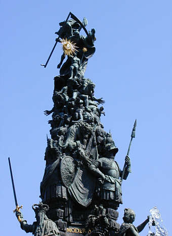 Grupello-Brunnen auf dem Paradeplatz Pyramiden-Spitze Über den Trophäen in einem kaum zu entwirrenden Knäuel die Laster (nicht einzeln definiert), gegen die Herkules mit seiner Keule kämpft. Der Held wird dabei von vier Löwen unterstützt. |