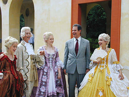 Finanzminister Gerhard Stratthaus MdL als oberster Dienstherr der Staatlichen Schlösser und Gärten bei der Begrüßung durch die "Hofdamen" der Tanzgruppe "I Danzatori Palatini"