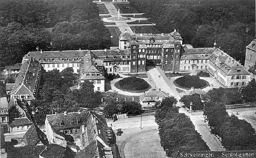 Der dahinter gelegene Park ist mit großen Bäumen bestanden, die die Struktur des Gartens verdecken. Vor allem die Zirkelhäuser sind nicht zu sehen.
