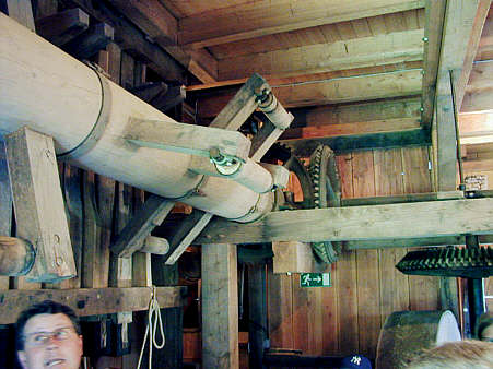 Die hölzerne Welle für die Ölpresse trägt mit Rollen versehene Nocken, die die Stempel anheben und wieder freigeben. |