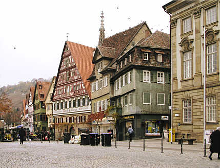 mit z.T. verputzten Fachwerkhäusern, vorn rechts das Rathaus, ein barockes Patrizierpalais, im Hintergrund der Turm der Frauenkirche.