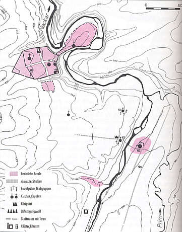 Siedlungsentwicklung Nach dem verheerenden Stadtbrand wurde Rottweil zu beginn des 13. Jahrhunderts an einer strategisch günstigeren Lage über dem Steilhang des Neckars neu errichtet. |