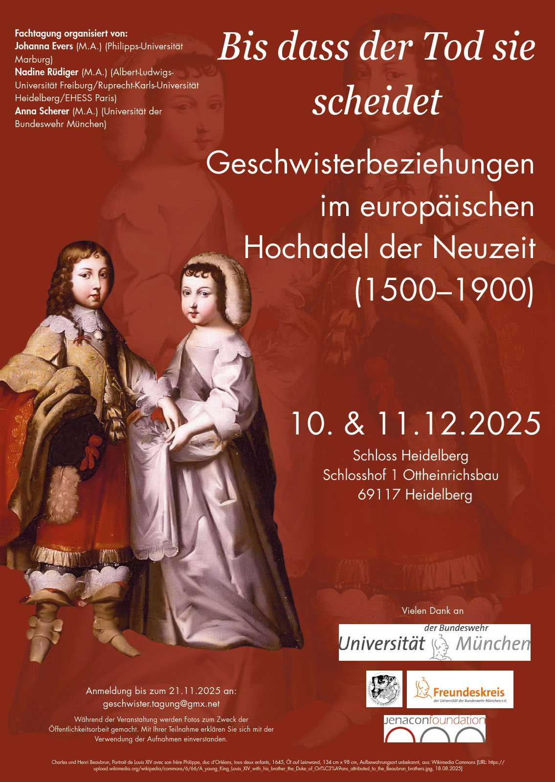 Oft halten sie wie Pech und Schwefel zusammen, manche sind sich jedoch spinnefeind: Die komplexen Beziehungen zwischen Brüdern und Schwestern können sehr unterschiedlich sein – sowohl heute als auch in der Vergangenheit. Bei der zweitägigen wissenschaftlichen Tagung „Bis dass der Tod sie scheidet. Geschwisterbeziehungen im europäischen Hochadel der Neuzeit (1500–1900)“ stehen Geschwisterpaare über einen Zeitraum von 400 Jahren im Fokus. Die Tagung im Ottheinrichsbau von Schloss Heidelberg am Mittwoch, 10. Dezember, und Donnerstag, 11. Dezember, wird von Verantwortlichen der Philipps-Universität Marburg, der Albert-Ludwigsburg-Universität Freiburg, der Ruprecht-Karls-Universität Heidelberg, der École des hautes études en sciences sociales in Paris und der Universität der Bundeswehr München organisiert.