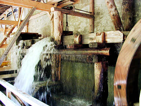 Gipsmühle, Pöllatschlucht (Schwangau) Oberschlächtiges Mühlrad. Im Bild die Absperrung des Wasserzulaufs auf das Mühlrad. Das überschüssige Wasser fließt seitlich aus der Rinne. |