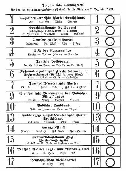 Stimmzettel zur Reichstagswahl (Baden), 7. Dezember 1924