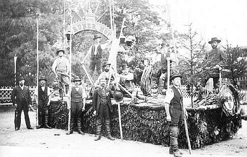 | Dazu gehören die zahlreichen Festwagen, die Industrie und Handwerk - oder in den Worten der Zeit, den Gewerbefleiß" - darstellen, wie hier den Festwagen der Schiltacher Holzflößer oder den der Metallpatronenfabrik Karlsruhe, dazu gehören aber auch die drei Abteilungen des Zugs mit der Darstellung der badischen Volkstrachten. | |||||||||