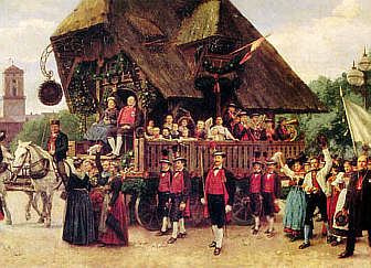 Auf dem ersten Wagen war, wie in ländlichen Gegenden des Schwarzwalds damals tatsächlich üblich, die Aussteuer der jungen Braut aufgetürmt.