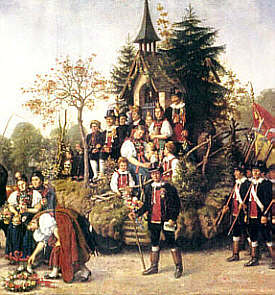 | Der zweite Wagen, der der Silbernen Hochzeit, war als Schwarzwaldhaus gestaltet, mit breitem Dach, und auf der Bank davor saß das Silberne Hochzeitspaar. Das war das Lebenswerk, auf das die beiden stolz sein konnten. |