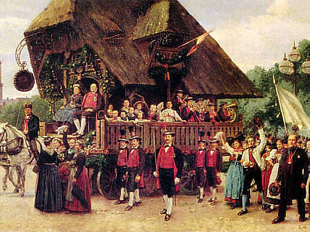Schwarzwaldhaus mit dem Brautpaar der Silbernen Hochzeit und der begleitenden Peterstaler Miliz |