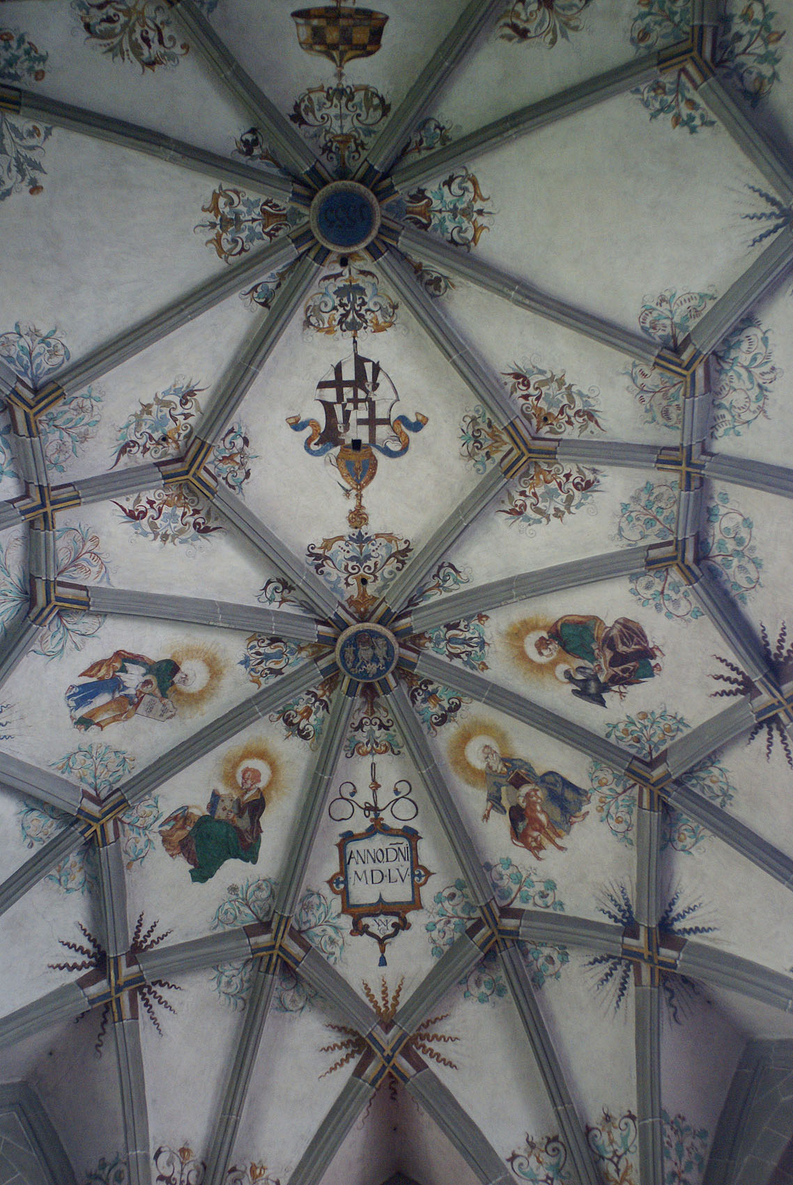 Unten: Netzgewölbe des 1457 - 1553 neu errichteten Chors mit den vier Evangelisten um den Schlussstein