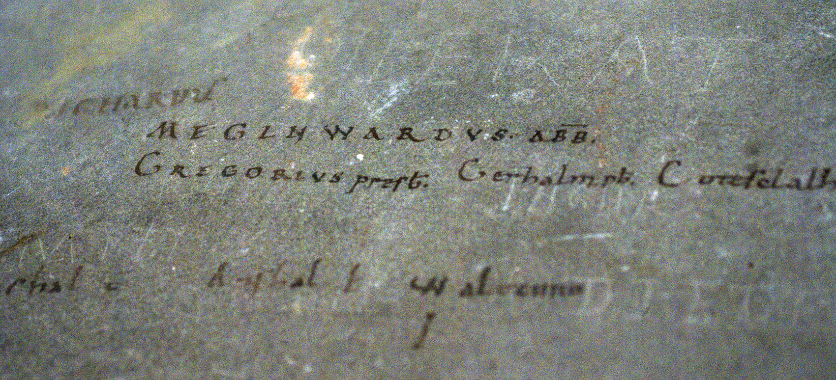 Die karolingische Altarplatte (nicht zugänglich) zeigt eingeritze Namen von Reichenauer Verbrüderungs- und Gebetsgemeinschaften (unten, digital aufgehellt und Originalansicht)