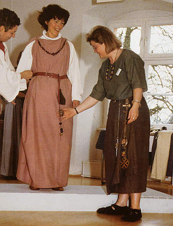 Zwei Mitarbeiterinnen des Archäologischen Landesmuseums Konstanz beim Tag der offenen Tür am 16. März 1996 in alamannischer Tracht. Hier ohne Fibeln, aber mit Gürtelgehänge als Statussymbol der alamannischen Frau.