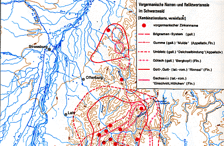 Übersichtskarte der vorgermanischen Namen und Reliktworträume im Mittleren und Südlichen Schwarzwald als Kennzeichen der Siedlungsräume der gallorömischen Bevölkerung zwischen dem 3. und 8. Jahrhundert. Wolfgang Kleiber: Sprachliche Kontinuität an Mosel und Mittelrhein, am Oberrhein und im Schwarzwald. Eine vergleichende Skizze. In: Aspekte und Probleme der römisch-germanischen Kontinuität. Sprachkontinuität an Mosel, Mittel- und Oberrhein sowie im Schwarzwald. Stuttgart: Steiner, 1992. Karte 64 |
