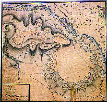 FreiburgPlan von Freiburg im Breisgau, wie solches Anno 1713 beschaffen war Nach 1678, während der Zeit der französischen Besetzung, errichteter Festungsgürtel, durch den französischen Festungsbaumeister Vauban angelegt. Die Süd- und Westfront (rechts oben und unten) in seiner "ersten Manier" errichtet, die Ostseite einfacher gehalten, da hier die Befestigungen des Schlossbergs den Schutz übernahmen. Freiburg war nach 1697 wieder österreichisch, wurde aber 1713 im SpanischenErbfolgekrieg erneut von Frankreich erobert. |