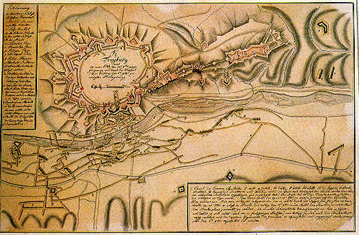 FreiburgPlan der französischen Belagerung von 1744 im Österreichischen Erbfolgekrieg Der Plan zeigt die Zerstörungen der Kaiserbastion und die Wirkung der Belagerungsartillerie auf die Südfront des Unteren Schlosses. Nicht eingezeichnet ist die Umleitung der Dreisam im Süden der Stadt. |