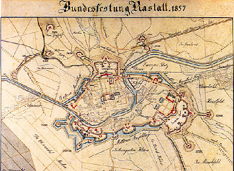RastattBundesfestung Rastatt 1857Plan der Stadt mit den zwischen 1841 und 1869 erbauten Festungswerken