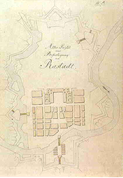 RastattPlan von Stadt und Festung, um 1705Der Plan ist eine Kopie des mittleren 19. Jahrhunderts nach einem älteren Plan aus der Entstehungszeit der 1698 begonnenen Festung.