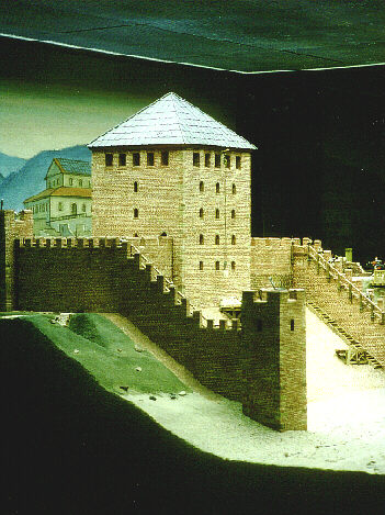 Modell des spätrömischen Burgus: Mehrstöckiger Steinturm, von einer Mauer umgeben, die sich zum Fluß hin in einer geschützten Schiffsanlegestelle öffnet.