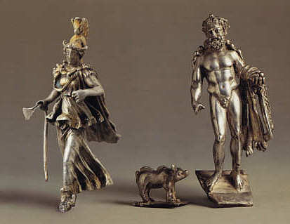 Brustpanzer und Gewandsaum vergoldet. Die Darstellung der