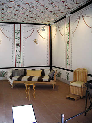 Aufenthaltsraum mit hellgrundigem Freskenschmuck Die Fresken der Innenräume sind in Xanten nicht überliefert, sondern wurden nach dem Vorbild anderer Orte rekonstruiert.