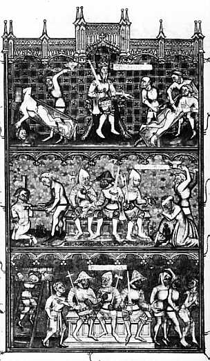 RechtspflegeHinrichtungsarten Das Mittelalter war, was die Verurteilung und Hinrichtung eines Verbrechers anging, nicht zimperlich. Der menschlichen Fantasie konnte freier Lauf gelassen werden, da man von der Vorstellung ausging, dass einem Verbrecher die seinen Taten entsprechende Hinrichtungsart zukommen müsse. |