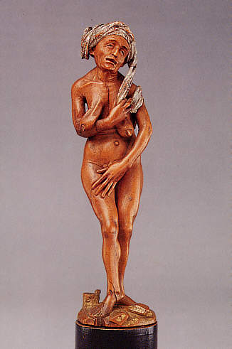 Oberrheinisch (Umkreis Hans Wydyz?), Ende 15. Jahrhundert Kleine, sehr realistisch skulptierte Darstellung einer Frau, die mit ihren körperlichen Eigenheiten dem Gegenteil des "schönen" Idealbilds entspricht. Angesichts der Tatsache, dass Frauen ab ihrem 16. Lebensjahr bis zu 20 Schwangerschaften durchmachten, dürfte diese Frau ca 30 bis 35 Jahre alt sein |