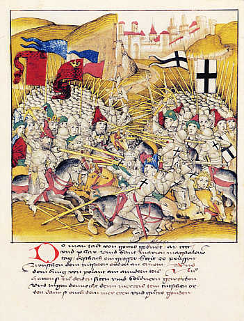 Schlacht von Tannenberg, 1410Die Schlacht von Tannenberg (Grunwald) war einer der Höhepunkte in der Auseinandersetzung des Deutschen Ritterordens mit dem polnischen Königtum. Der Ritterorden beanspruchte für sich die Mission in Litauen, was das polnische Königtum als Eingriff in seine Inteerssensphäre betrachtete. |