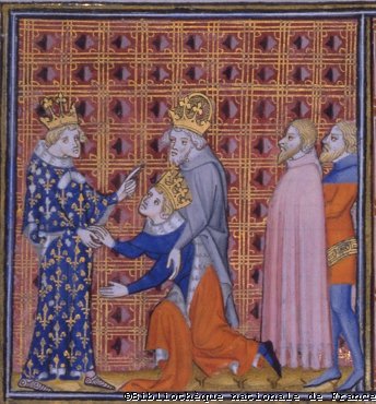 König Wenzel "der Faule"König Wenzel erweist dem französischen König Charles V. die Ehre Grandes Chroniques de France Charles' V. Bilderhandschrift, 14. Jh.