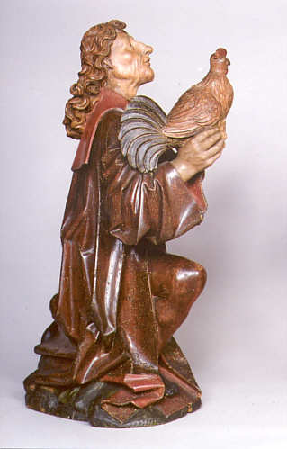 Figur aus dem Isenheimer Altar: Ein Mann mit feinen Gesichtszügen, mit offenbar ledernen Beinlingen, langem Mantel und freiem lockigem Haar bringt dem heiligen Antonius als dem Hauptheiligen des Altars einen Hahn als Gabe dar.