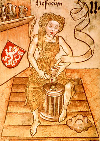 Töpferin an der Drehscheibe. Mit einem gezackten Holzmesser bringt sie die Riefeln auf das nasse Tongefäß auf.