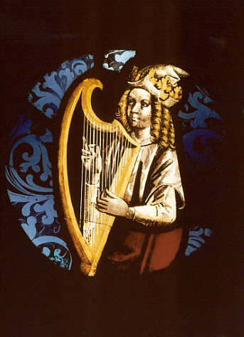 | Das bei der Restaurierung 1847-49 ausgeschiedene Fragment stammt aus einer vier Felder umfassenden Darstellung der Wurzel Jesse in dem von Graf Eberhard im Bart gestifteten Achsenfenster im Chor der Tübinger Stiftskirche; dort saß der Harfe spielende König David in rosaviolettem Laubwerk. Nach jüngsten Überlegungen von Hartmut Scholz dürfte Hans von Maursmünster der Schöpfer dieses Fensters sowie der jüngeren Wurzel-Jesse-Darstellungen im Kramerfenster des Ulmer Münsters und im Volckamerfenster der Nürnberger Lorenzkirche gewesen sein. Er und nicht Peter Hemmel wäre somit für die folgenreiche Entwicklung der übergreifenden Bildkompositionen innerhalb der Straßburger Werkstattgemeinschaft verantwortlich gewesen. | |||||||||