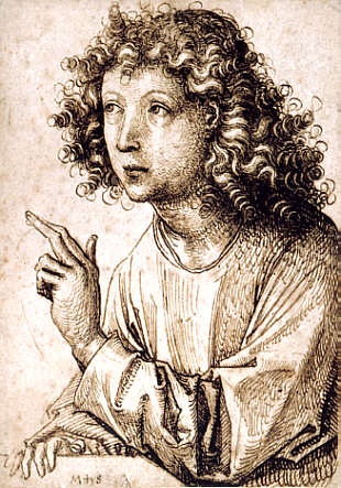 Federzeichnung in Braun, um 1470 Schongauer arbeitet mit feinen und ausführlichen Parallelschraffuren, um dem Bild eine starke Plastizität zu geben. In der üppigen Lockenpracht suggerieren helle Haarsträhnen neben dicht gesetzten Linien Lichtreflexe auf der von lnks beschienenen Figur, die sich auch auf dem gesicht und dem gefältelten Gewand niederschlagen. |