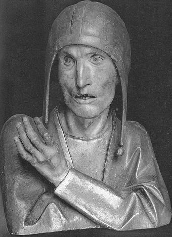 Holz, vollrund, Höhe 45,2 cm Die Büste scheint noch der Tradition Niclaus Gerhaerts verpflichtet, doch wirkt das asketische Gesicht mit den fast fanatisch blickenden Augen flächiger, gotischer, als die Vorbilder. |