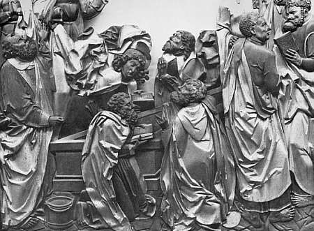 Das Relief zeigt die Jünger um den leeren Sarkophag versammelt, doch deutet die Komposition der Figuren darauf hion, dass sie das Ereignis der aufnahme Mariens in den Himmel noch nicht vergegenwärtigt haben. Nur einige der Apostel wenden ihren Blick bereits nach oben, wo in der vollständigen Tafel die Aufnahme Marias in den Himmel vermutet werden muss. Links am Bildrand Petrus, der, im Begriff, den Leichnam einzusegnen, überrascht nach oben blickt. |