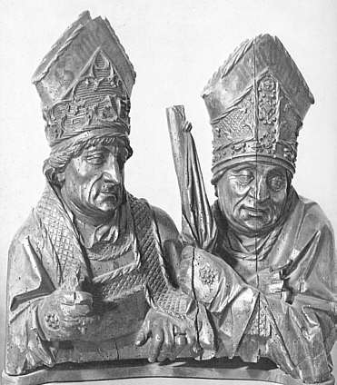 Straßburg, Anfang 16. Jahrhundert St. Egidianus und St. Benediktus, zwei Äbte des Schottenklosters Honau aus dem 11. Jahrhundert mit Abtsmitra und Kasel bzw. Chormantel. Aus dem Mitelteil des ehemaligen Hochaltars von Alt. St. Peter, wohin das Kloster Honau 1398 nach der Zerstörung durch den Rhein verlegt worden war. |
