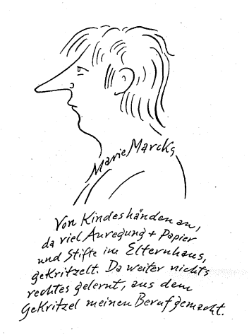 Im August 1922 in Berlin geboren, beginnt Marie Marcks schon früh mit dem Zeichnen: am Zeichentisch ihrer Mutter Else Marcks, die eine private Kunstschule leitet. Die Erfahrungen der Kriegs- und Nachkriegszeit bestimmen ihr Leben wie das so vieler Deutscher, lassen diese Zeit aber auch zum Aufbruchsignal für die eigene Unabhängigkeit werden. 1948 kommt Marie Marcks nach Heidelberg. Eine Generation vor der etablierten Frauenbewegung versucht sie die Synthese von bzw. den Spagat zwischen Berufsalltag und Familie, fließen familiäre Erfahrungen ebenso in das zeichnerische Werk ein wie das politische Wechselspiel der Kräfte seit dem deutschen "Wirtschaftswunder" unter Ludwig Erhard. |