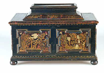 Kassette, die reich mit Chinoiserien bemalt ist. Die von verkröpften