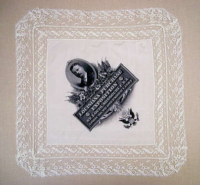 | Eine wichtige Rolle spielte das Taschentuch im Mittelalter als Objekt des Minnedienstes in Form eines Liebes-, Treue- oder Tapferkeitspfandes. Somit wurde es zum Luxusgegenstand und Statussymbol des Rittertums bzw. Adels und sollte dies bis ins späte 18. Jahrhundert bleiben. Vor allem in den Epochen der Renaissance und des Barock war das in der Hand gehaltene Ziertuch an Prunk kaum zu überbieten und teilte zusammen mit Spitzenkragen und -manschetten etwas über den Stand und die finanziellen Mittel des Besitzers mit. Bereits im frühen 18. Jahrhundert findet sich das Taschentuch auch als Propaganda- oder Werbemittel. Politische Ereignisse, Landkarten, Porträts, aber auch Karikaturen bedeutender Persönlichkeiten wurden als Chromlithografie oder in der kostengünstigeren Kupferstichtechnik auf möglichst feinfädigen Stoff gedruckt. Ihres kleinen Formats wegen waren solche Tücher als Souvenir sehr beliebt und von keinerlei Ausfuhrverboten betroffen. Das vorliegende Objekt wurde anlässlich der Weltausstellung von 1904 in St. Louis / U.S.A. hergestellt, wohl als Souvenirgegenstand und Werbemittel. Das Motiv zeigt den damaligen, überaus populären Präsidenten Theodore Roosevelt, die Schrifttafel soll an das 100jährige Jubiläum des Ankaufs des Mississippi-Tales erinnern. | |||||