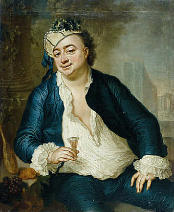 Mit seiner Lebensmaxime "vivere et laetari" - leben und sich freuen - führte er einen aufwendigen Lebensstil, blieb unverheiratet, hatte aber zeitlebens wechselnde Gespielinnen und gehörte seit 1743 dem "Ordre des hermites de bonne humeur" an, dem Eremitenorden der heiteren Einsiedler, in dem er den Ordensnamen "Tourbillon" - Wirbelwind - trug. Zu den Statuten gehörte es, Kummer und schlechte Laune aus der Seele zu verbannen, die Devise und Grußformel lautete "Vive la joye". Gotter hat sich zeitlebens porträtieren lassen, darunter mehrfach in wechselnden Rollen, z.B. als Jäger im Jägerhabit, als Orientale mit Turban oder auch in Begleitung eines jungen Mädchens als Pilger nach Cythera, der Insel der Venus. Das kleinformatige intime Heidelberger Bildnis Anna Dorothea Therbuschs zählt zu diesen barocken "portraits historiées". Therbusch präsentiert den Epikuräer mit seiner massigen Gestalt, ausdrucksvollem Gesicht und ausgeprägtem Doppelkinn in lässiger Kleidung: eng sitzender Jacke und Hose aus delikat gemaltem blauen Seidenstoff, tief auf die Brust geöffnetem Hemd mit üppig berüschten Manschetten, auf dem perückenlosen Kopf eine schräg sitzende trauben- und bändergeschmückte Strohkappe. Seine Linke ist auf den gespreizten Oberschenkel, der rechte Arm auf einen Tisch gestützt, wo ein Stillleben mit Obst, Weintrauben und Weinflasche steht. In seiner fleischigen Hand hält Gotter geziert ein winziges Weinglas. Text: Annette Frese |