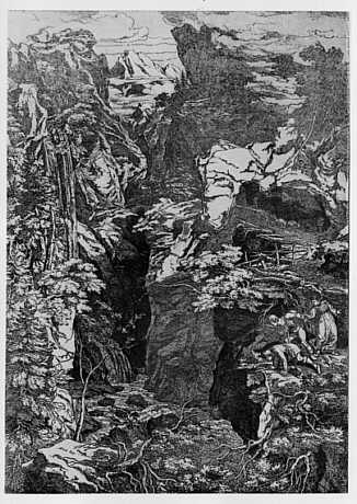 Die Via Mala gehört zu den am häufigsten dargestellten Schluchten in den Schweizer Bergen und war für die reisenden Künstler des 19. Jhdts. einer der Hauptanziehungspunkte in Graubünden. Zwischen 1792 und 1794 hielt sich Joseph Anton Koch in der Schweiz auf. Bei seinen Wanderungen durch die Alpen entstanden zahlreiche Naturstudien; eine Motivsammlung, auf die er bis ins hohe Alter zurückgriff. | ||||
