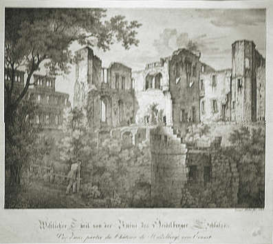 Ernst Fries: Westlicher Teil von der Ruine des Heidelberger Schlosses, 1828 Staatl. Schlösser und Gärten
