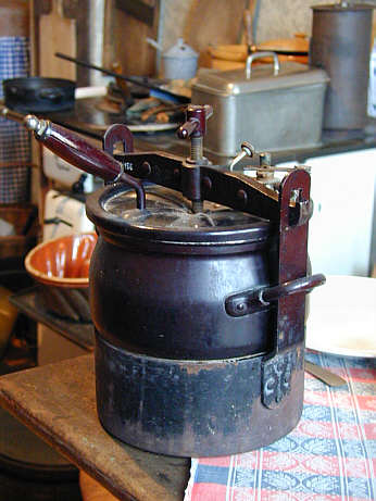 Dampfkochtopf Frühes Modell eines Dampfdruck-Kochtopfes mit festem Haltebügel |